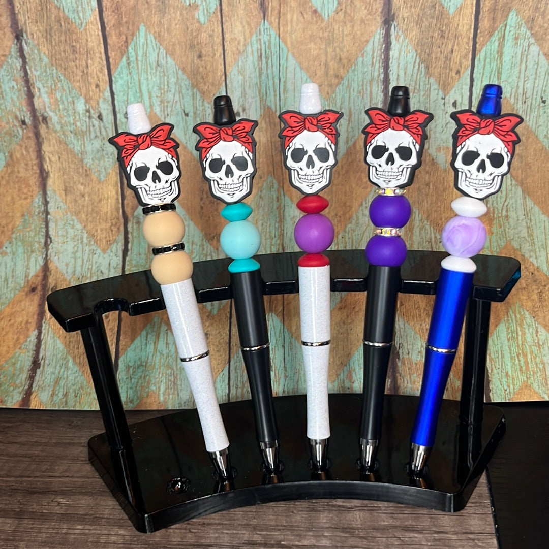Our skull pen features a red bandana on it. These come in Beaded Pens and Beaded Pencils.